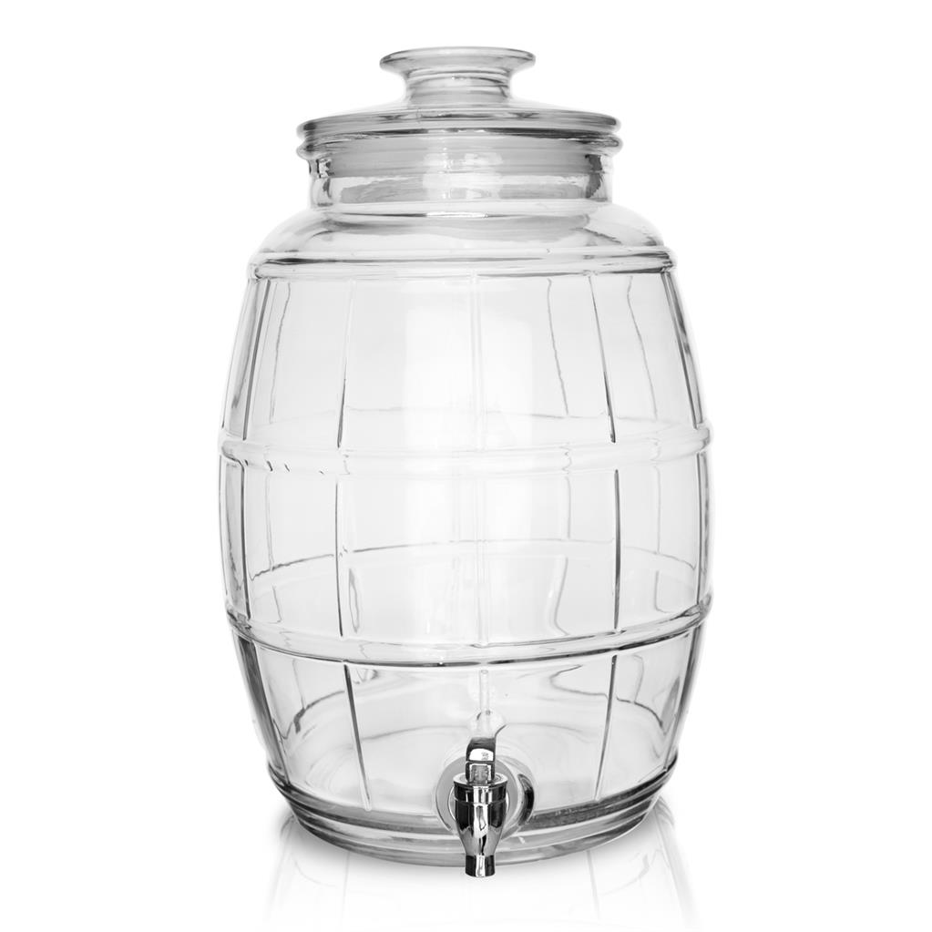 Prakticá, tvarovaná sklenená fľaša v tvare súdku s vekom, na podávanie osviežujúcich limonád v letných dňoch pre deti alebo na radu miešaných nápojov pre dospelých. Výhodou džbánu je kohútik, s ktorým ľahko nalejete svoj obľúbený nápoj do pripraveného pohára. Stačí páčku pootočiť o 90°. Nádobu pred prvým použitím treba dôkladne umyť teplou vodou a saponátom. Tento postup treba opakovať pred každým použitím. Nádoba nie je vhodná pre horúce a vriace tekutiny. Materiál: sklo, plast, silikónové tesnenie. Rozmery: priemer 23 cm, výška 36 cm, objem 10 l.