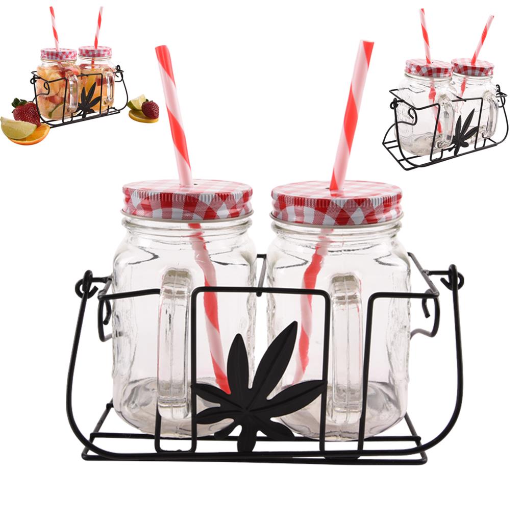 Sklenená fľaša s pevným skleneným uchom na lepšie uchopenie, s kovovým viečkom na závit a s farebnou plastovou slamkou. Súprava 2ks fľiaš + drôtený stojan.