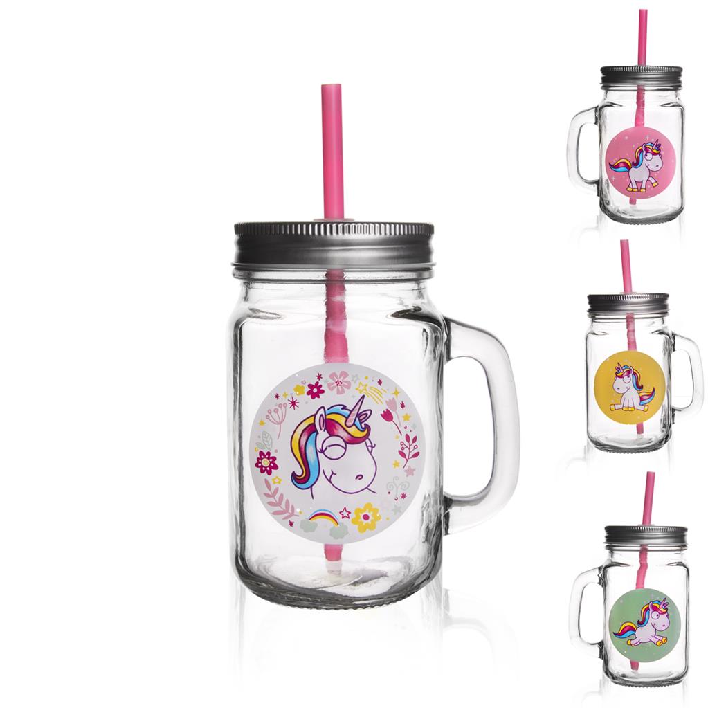 Sklenený pohár s viečkom a slamkou 0,5 l – JEDNOROŽEC