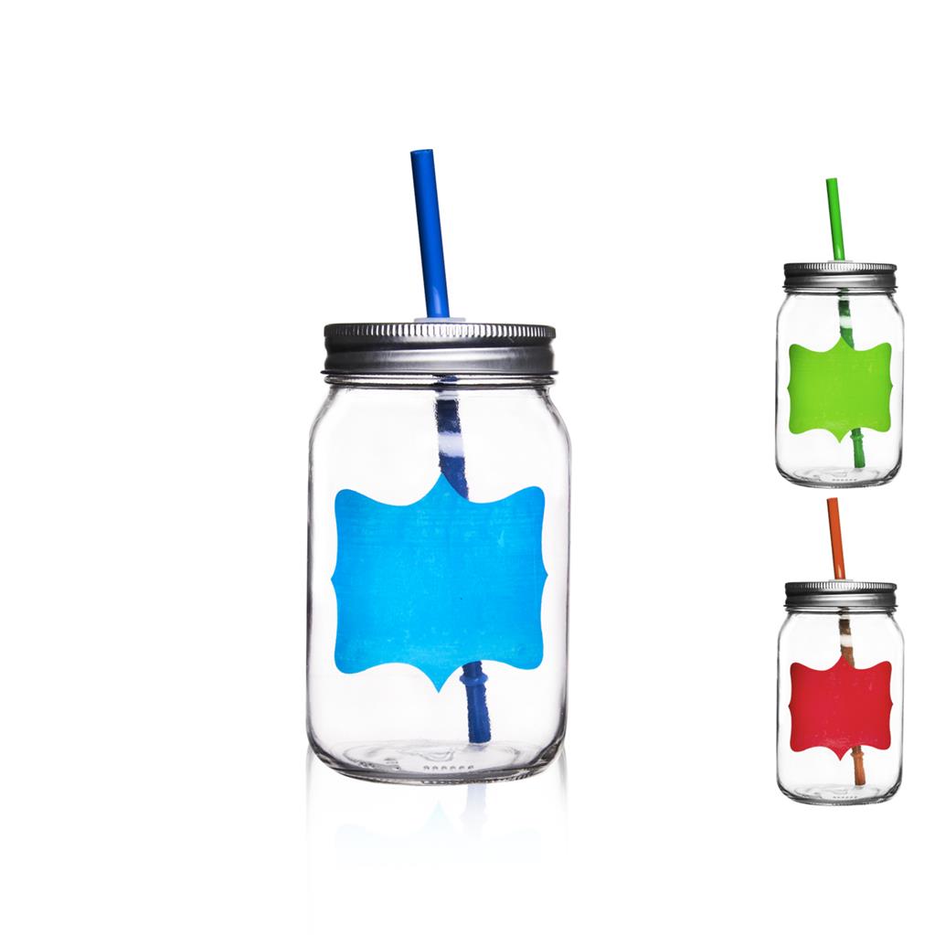 Sklenený pohár so závitom, s kovovým viečkom a s farebnou slamkou.