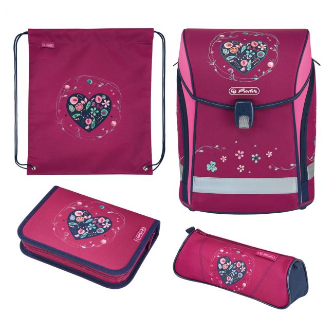 Školská taška Herlitz Midi, Srdce, sada, obsahuje 16-dielny peračník a vrecko na prezuvky. Zadná časť, ktorá sa opiera o chrbát je anatomicky tvarovaná a polstrovaná, kvôli správnemu držaniu tela. Široké dížkovo prispôsobiteľné popruhy na plecia sa dajú zapnúť na hrudi, čím sa zabezpečí väčšia stabilita pri nosení. Taška obsahuje jedno predné, dve bočné vrecká a vnútornú priehradku. Veľmi dôležitou súčasťou sú aj bezpečnostné reflexné prvky a zámok na magnet. Rozmery: 37 x 38 x 22 cm, váha: 1100g, objem: 16l.
