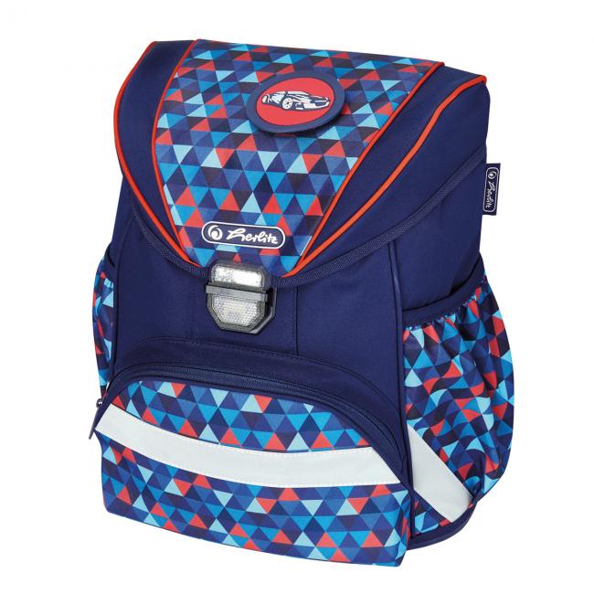 Školská taška Herlitz UltraLight, Trojuholníky má zadnú časť, ktorá sa opiera o chrbát anatomicky tvarovanú a polstrovanú, kvôli správnemu držaniu tela. Široké dĺžkovo prispôsobiteľné popruhy na plecia sa dajú zapnúť na hrudi, čím sa zabezpečí väčšia stabilita pri nosení. Taška obsahuje jedno predné a dve bočné vrecká. Veľmi dôležitou súčasťou sú aj bezpečnostné reflexné prvky a zámok na magnet. Rozmery: 36 x 28 x 21 cm, váha: 650g, objem: 15l.