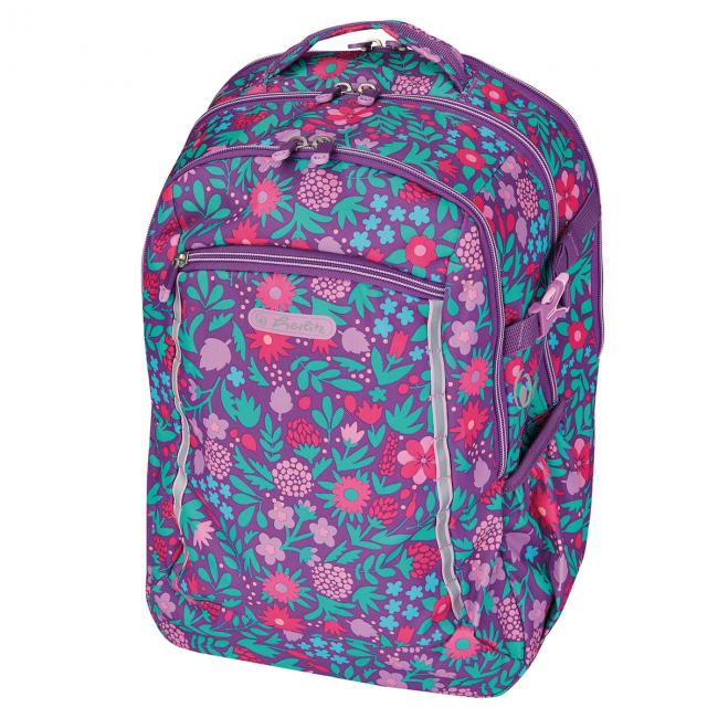 Školský batoh Herlitz Ultimate, Kvety má zadnú časť, ktorá sa opiera o chrbát anatomicky tvarovanú a polstrovanú, kvôli správnemu držaniu tela. Široké dĺžkovo prispôsobiteľné popruhy na plecia sa dajú zapnúť na hrudi, čím sa zabezpečí väčšia stabilita pri nosení. Batoh obsahuje tri vnútorné priehradky na zips, jedno predné a dve bočné, elastické vrecká. Pevné dno s plastovými nožičkami zabezpečí väčšiu stabilitu. Veľmi dôležité sú aj bezpečnostné reflexné prvky. Rozmery: 41 x 31 x 22 cm, hmotnosť: 750 g, objem: 24 l.