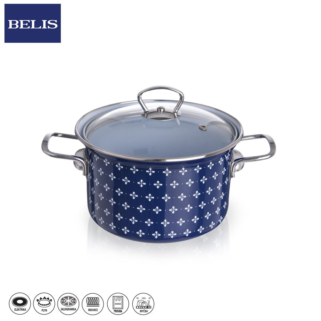 Smaltovaný hrniec so sklenenou pokrievkou je vhodným na varenie polievky, omáčky, cestovín, zemiakov a iných príloh. Má kovové uši. Ide o kvalitný český riad. Na pokrievke nájdete otvory, cez ktoré bude unikať para. Materiál: plech s hrúbkou 1 až 1,2 mm, vo vnútri modro-sivý granit – najkvalitnejší druh smaltu (ide o smalt s vyšším obsahom kremíka, čo zabezpečí jeho zvýšenú odolnosť proti mechanickému poškodeniu), zvonka modrý smalt, sklenená pokrievka, nerezové kovanie. Rozmery: objem 2,8 l, priemer 18 cm, výška 12/16 cm. Hrniec môžete očistiť aj v umývačke riadu. Rovnako je vhodný na všetky typy spotrebičov vrátane indukcie. Smaltované nádoby majú výhodu v tom, že sú zdravé a hygienické: smalt chráni potraviny proti prenikaniu škodlivých kovových iónov a na hladkom povrchu sa nemnožia baktérie. Hrniec má veľmi pekný a zaujímavý vzhľad. Hrniec sa ľahko čistí a je odolný voči mechanickému poškodeniu.