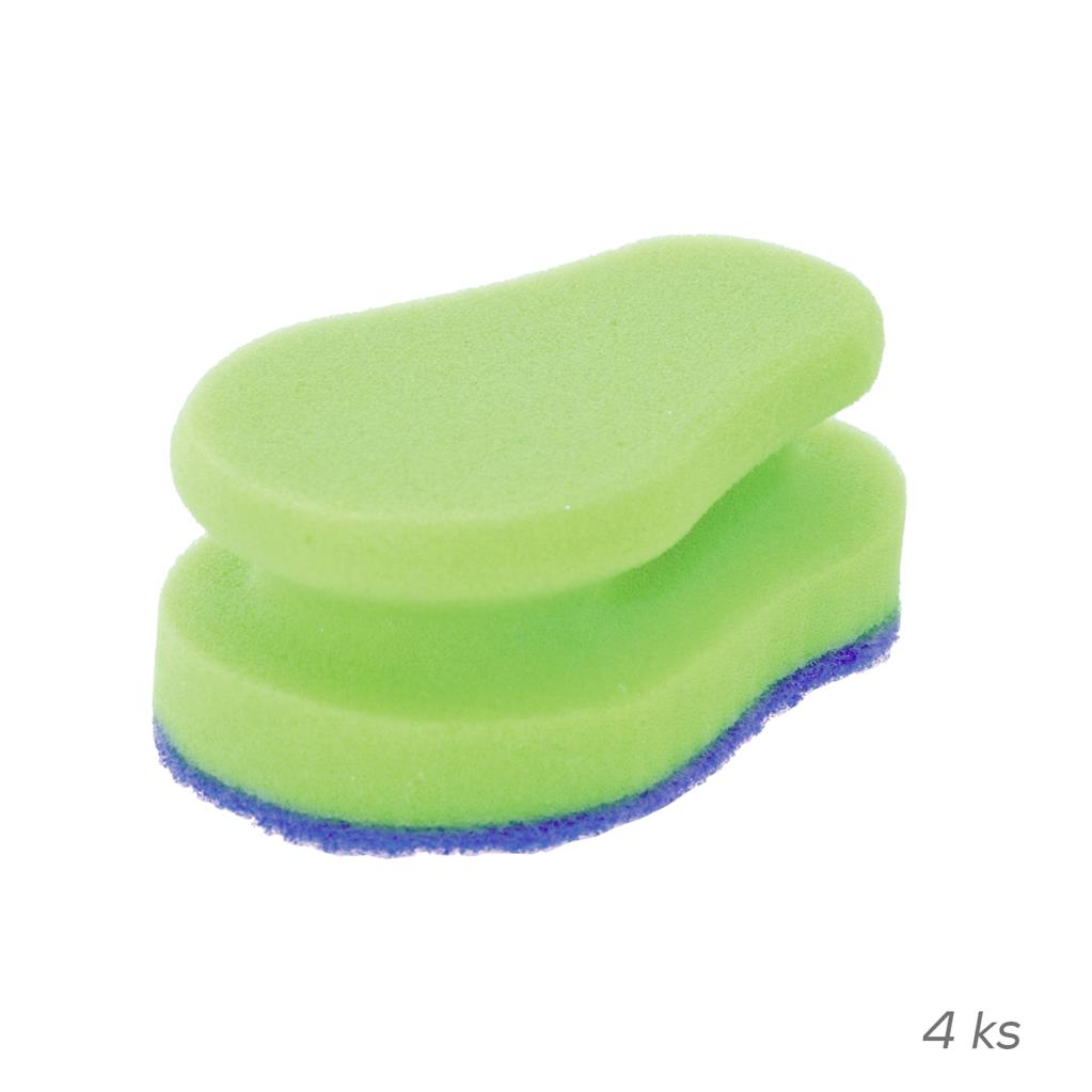 Špongia na riad v tvare hrušky s drôtenkou, špeciálny tvar má viacnásobné využitie. Vhodná na lesklé povrchy, teflón a sklokeramické dosky. Materiál: polyuretanová pena, neškrábavý vlies. Rozmery: 10x7x4,5 cm.