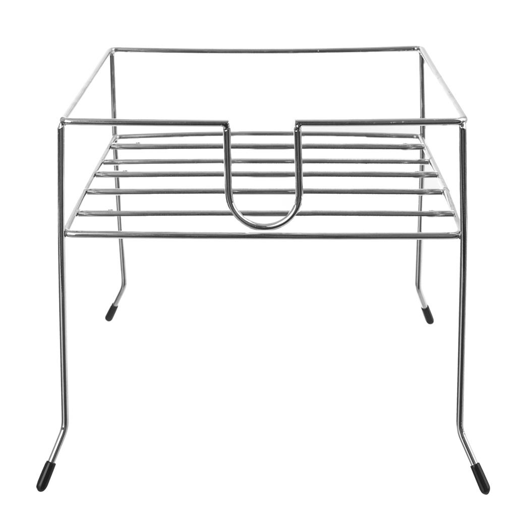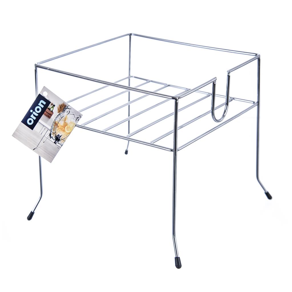Stojan na fľaše s priestorom na kohútik je vyrobený z pochrómovaného kovu. Je vhodný na hranaté či guľaté fľaše. Ľahko sa udržiava a jeho výhodou je že nezaberie veľa miesta. Môžete k nemu použiť fľaše z našej ponuky, ktoré majú produktové čísla: 143750, 125584, 123378, 143738, 125968, 143746. Materiál: pochromované železo, plast (kryt nožičiek). Rozmery: 21,5×21,5×20 cm, vnútorné 20,5×20,5 cm.