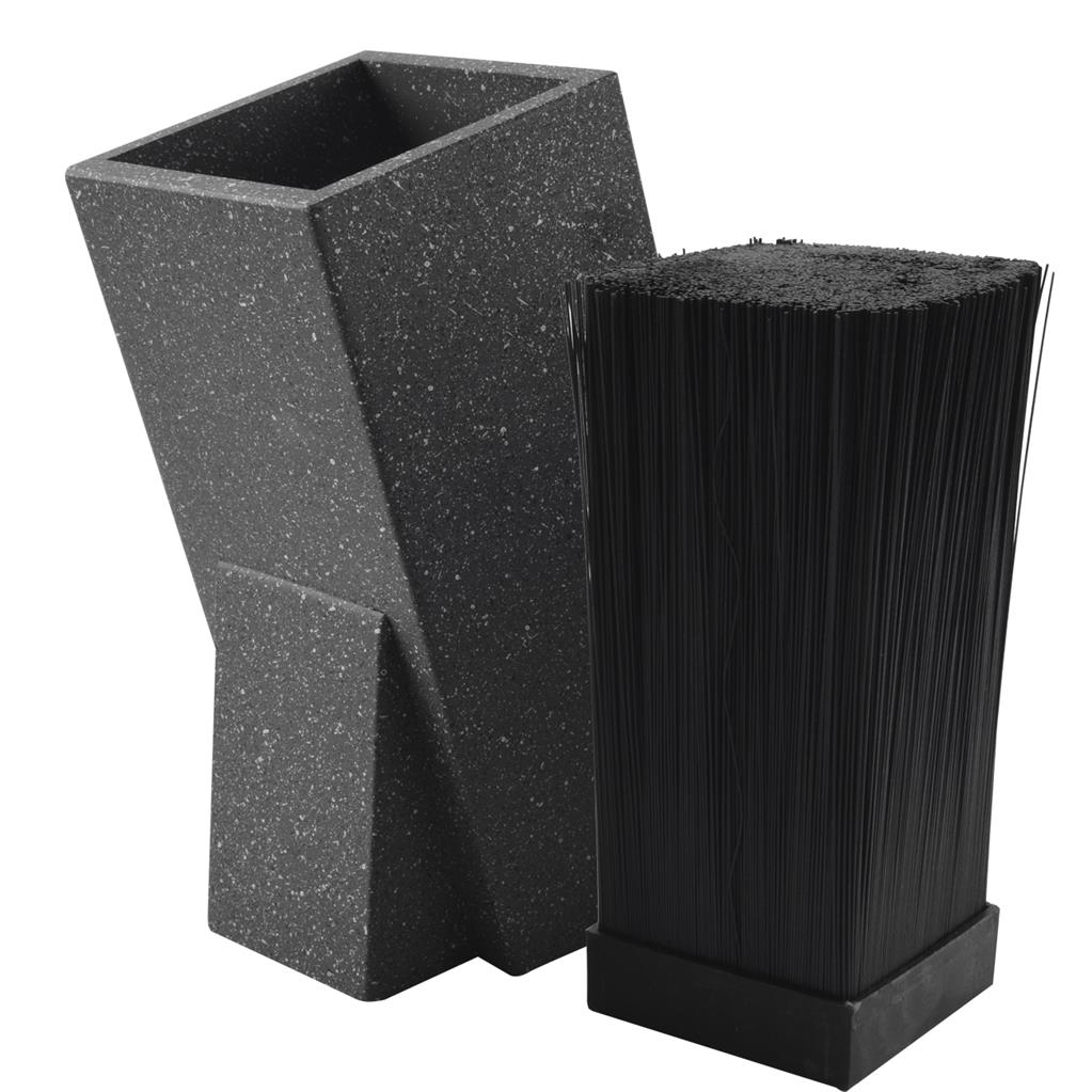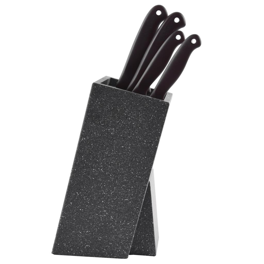 Drevený stojan na nože MRAMOR je vyrobený z kvalitného dreva upraveného poplastovaním a má štvorcový tvar. Vnútornú časť tvorí vložka s plastovými štetinami. Tá slúži na bezpečné uloženie nožov tak, aby nedošlo k otupeniu čepelí. Vložka sa dá vybrať a umyť v umývačke riadu. Rozmery: 11×14,5×24 cm.