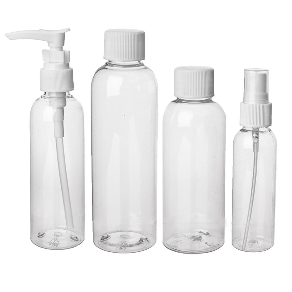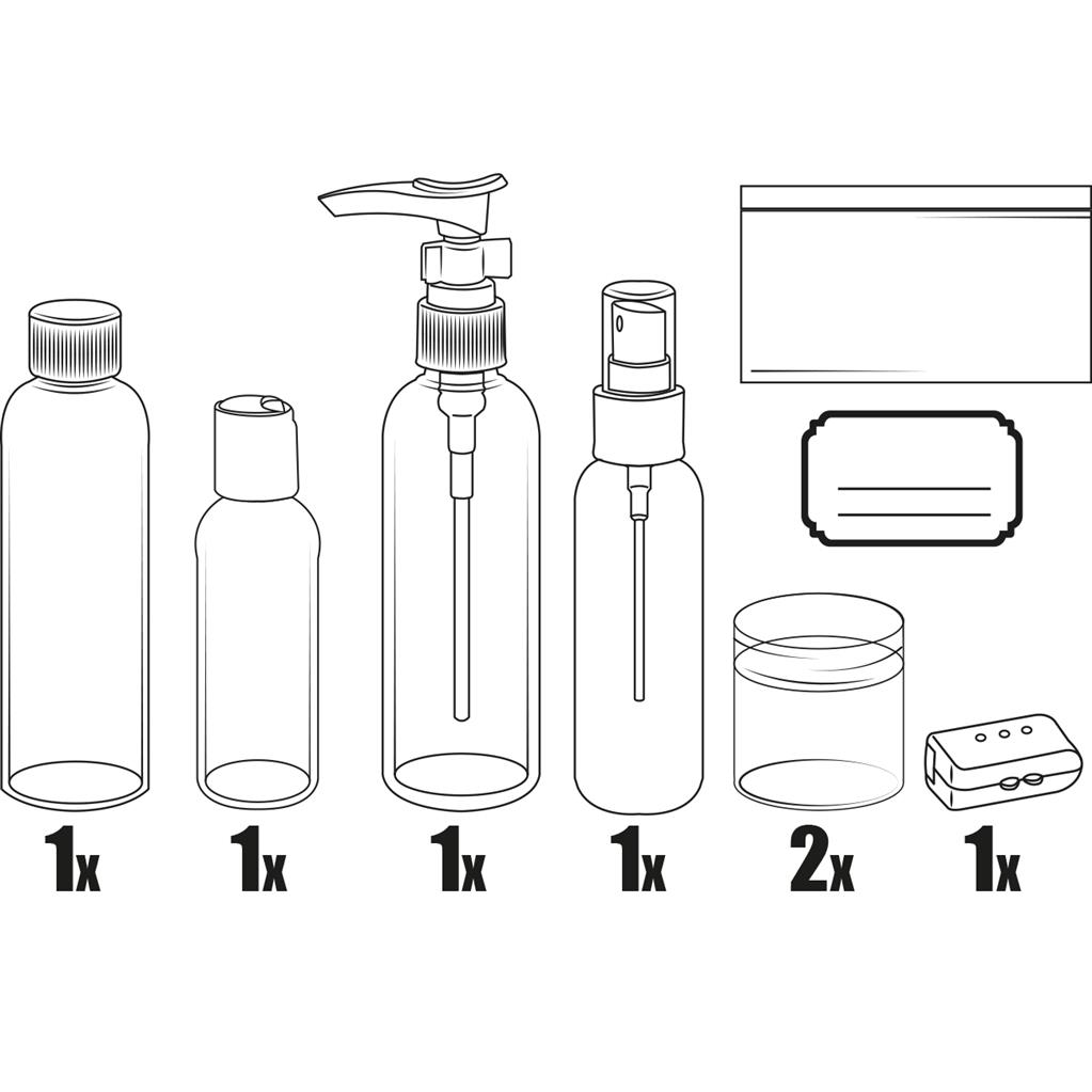 Praktický cestovný set na nadávkovanie šampónov, kondicionérov, krémov, gélov, voňaviek, ústnych vôd atď. Pri navrhovaní súpravy sa pamätalo i na to, aby spĺňala kritériá pre batožinu do lietadla (maximálny objem: 100 ml, fľaštičky aj taška sú z priehľadného plastu).