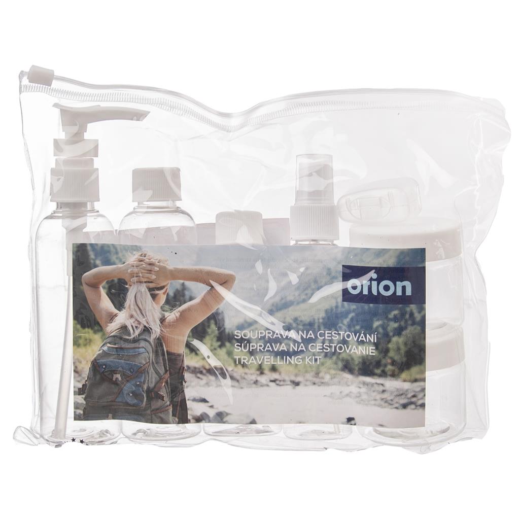 Ak sa chystáte na služobnú cestu, dovolenku, do kúpeľov alebo posielate vaše ratolesti do viacdenného tábora, v batožine podstatne ušetríte miesto, ak zo svojej obľúbenej kozmetiky vezmete len potrebné množstvo. Praktický set využijete na nadávkovanie šampónov, kondicionérov, krémov, gélov, voňaviek, ústnych vôd atď. Pri navrhovaní tohto cestovného setu sa pamätalo i na to, aby spĺňal kritériá pre batožinu do lietadla (maximálny objem: 100 ml, fľaštičky aj taška sú z priehľadného plastu). Priehľadné puzdro obsahuje: 1 x fľaštička so závitovým uzáverom 100 ml (priemer 3,5 cm , výška 12 cm ),1x fľaštička s dávkovačom vo viečku 90 ml (priemer 3,5 cm , výška 11 cm ),1x fľaštička s pumpičkou 100 ml (priemer 3,5 cm , výška 15 cm ),1x fľaštička s rozprašovačom 70 ml (priemer 3 cm , výška 13 cm ), 2x dózička s viečkom na závit 70 ml (priemer 5 cm , výška 4,8 cm ),1x kryt na zubnú kefku a 6 ks samolepiek pre označenie. Materiál: plast.
