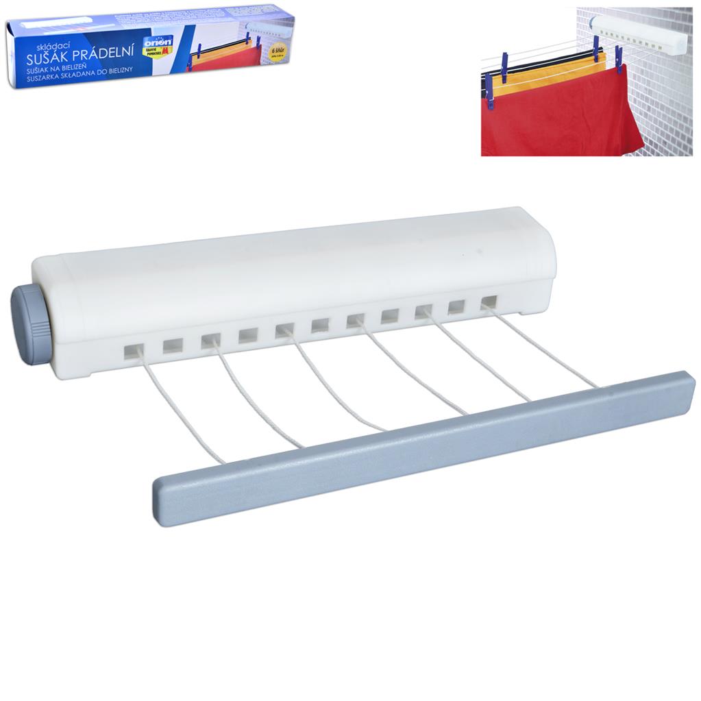 Sušiak na bielizeň zvinovací obsahuje šesť šnúr. Dá sa použiť v interiéri ale aj v exteriéri. Podľa potreby môžeme šnúry kedykoľvek vytiahnuť a po použití znova vrátiť do púzdra. Nebudú tak permanentne zaberať miesto či už v kúpeľni, na terase, alebo na balkóne. Materiál: plast. Rozmery: 37x6x6,5 cm, maximálna dĺžka šnúr 3,66 m. maximálne zaťaženie 3 kg.