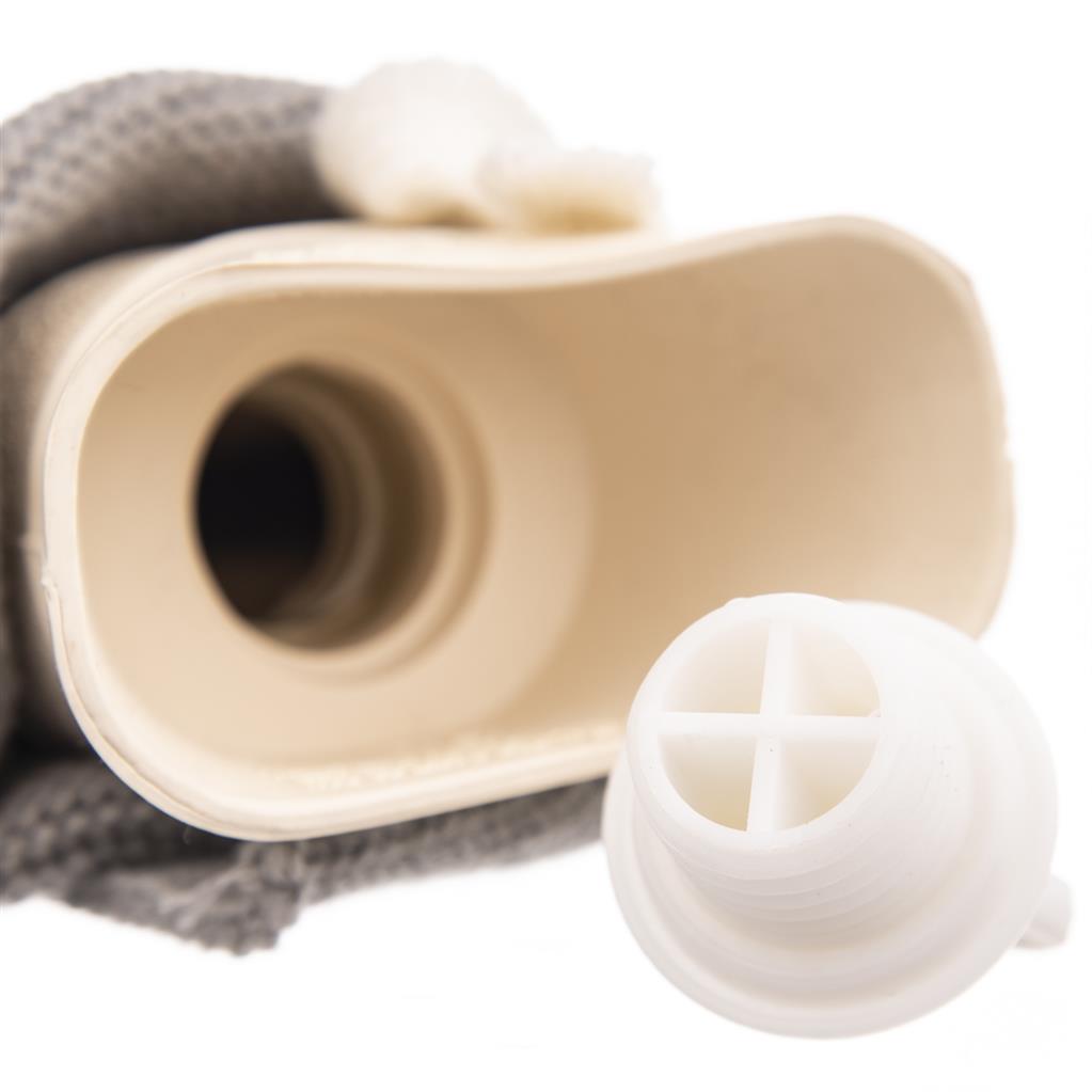 Termofľaša slúži na lokálne zahrievanie časti ľudského tela, ale tiež pomôže pri bolesti svalov či brucha. Má dlhý úzky tvar, ktorý sa hodí na príjemné zahriatie šije či bedier. Stačí len do nej naliať teplú vodu, max. 40°C. Vďaka skrutkovému uzáveru fľašu pevne zavriete. Má snímateľný vak, ktorý je možné oprať na 30°C. Materiál: guma, 100% akryl. Rozmery: 11×75 cm, objem 1,7 l.