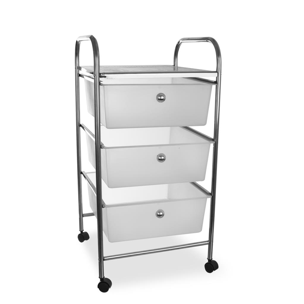 Odporučiť Tento šikovný úložný chrómový regál s tromi zásuvkami, ktorý sa skvele bude hodiť na detské hračky, kuchynské potreby alebo kozmetiku. Podľa potreby ho môžete presúvať tam, kam potrebujete. Materiál: chróm, kvalitný plast. Dodanie v demonte. Rozmery: 33x33x64,5 cm.