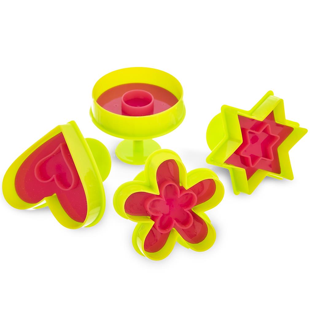 Plastové vykrajovačky rôznych tvarov, na zdobenie torty, koláčov a podobne. Z marcipánového cesta vykrojíte požadovanú veľkosť zo 4 možných tvarov, ktorú ďalej môžete formovať. Sada obsahuje 4 rôzne vykrajovačky. Môžete ich umývať v mývačke riadu. Rozmery: priemer cca 6,5 cm.