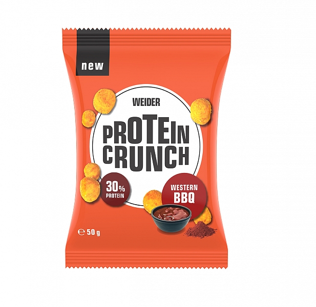 Väčšina z nás má rád chrumky a chipsy, avšak tieto dobroty sú plné kalórií a ešte k tomu aj bez živín. Telu viac škodia a berú, ako dávajú. S tým je však koniec. Vymeňte nezdravé za zdravé vďaka Weider Protein Crunch, 50g. Ide o proteínové chrumky so skvelou príchuťou barbecue. Už sa nemusíte trápiť, že pri strate kontroly ste zjedli chrumky alebo chipsy plné kalórií. Produkt Weider Protein Crunch, 50g obsahuje až 30% bielkovín z vysoko kvalitnej srvátkovej a ryžovej bielkoviny. Nenájdete v nich ani sóju, ani pšenicu. Je to vkusná a chrumkavá pochúťka.