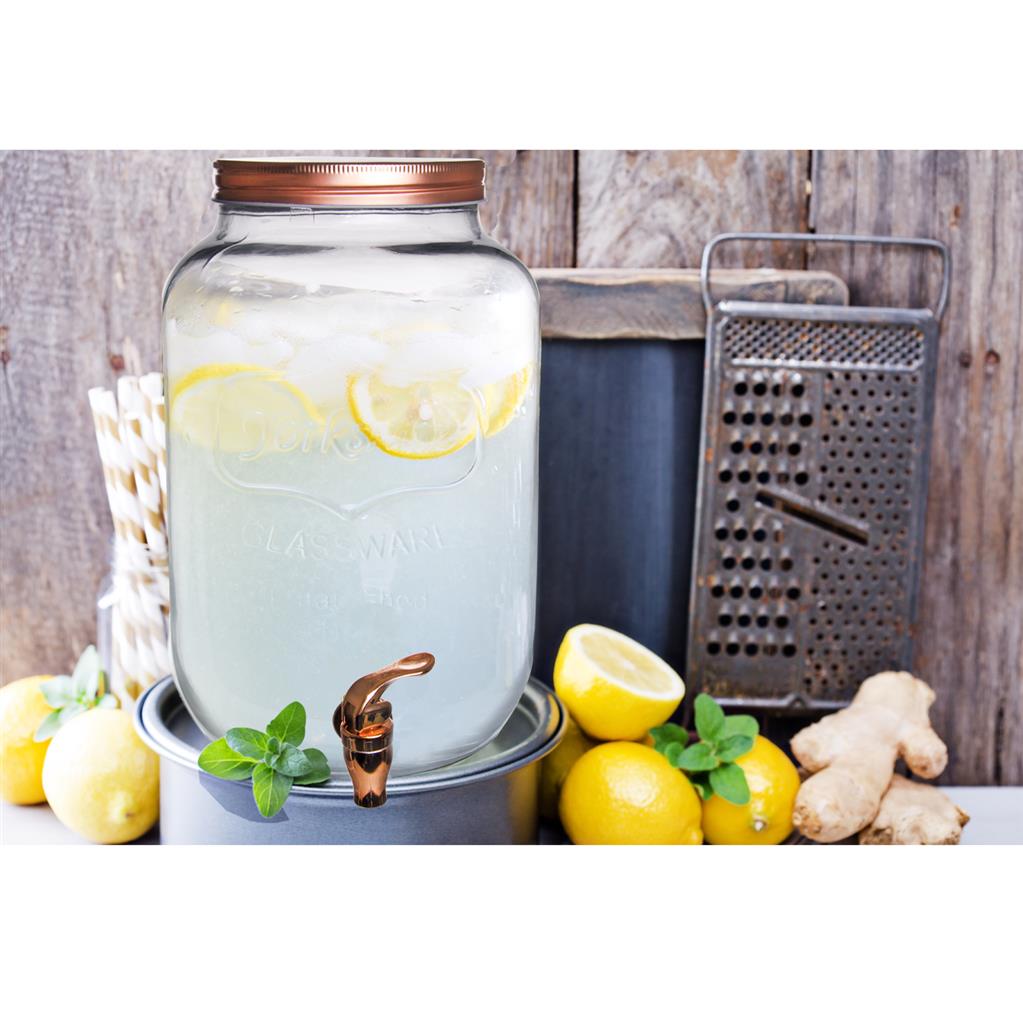 Sklenený nápojový zásobník, s medeným prevedím viečka a kohútiku predstavuje štýlový spôsob, ako v lete pri záhradných slávnostiach či grilovaní servírovať kokteily, ľadový čaj, domáce limonády a šťavy, ale tiež napríklad aj pivo. Materiál: sklo, kov, plast, silikónové tesnenie. Zásobník nie je vhodný na horúce tekutiny. Rozmery: objem 8,8 l, 20x20x31,5 cm.