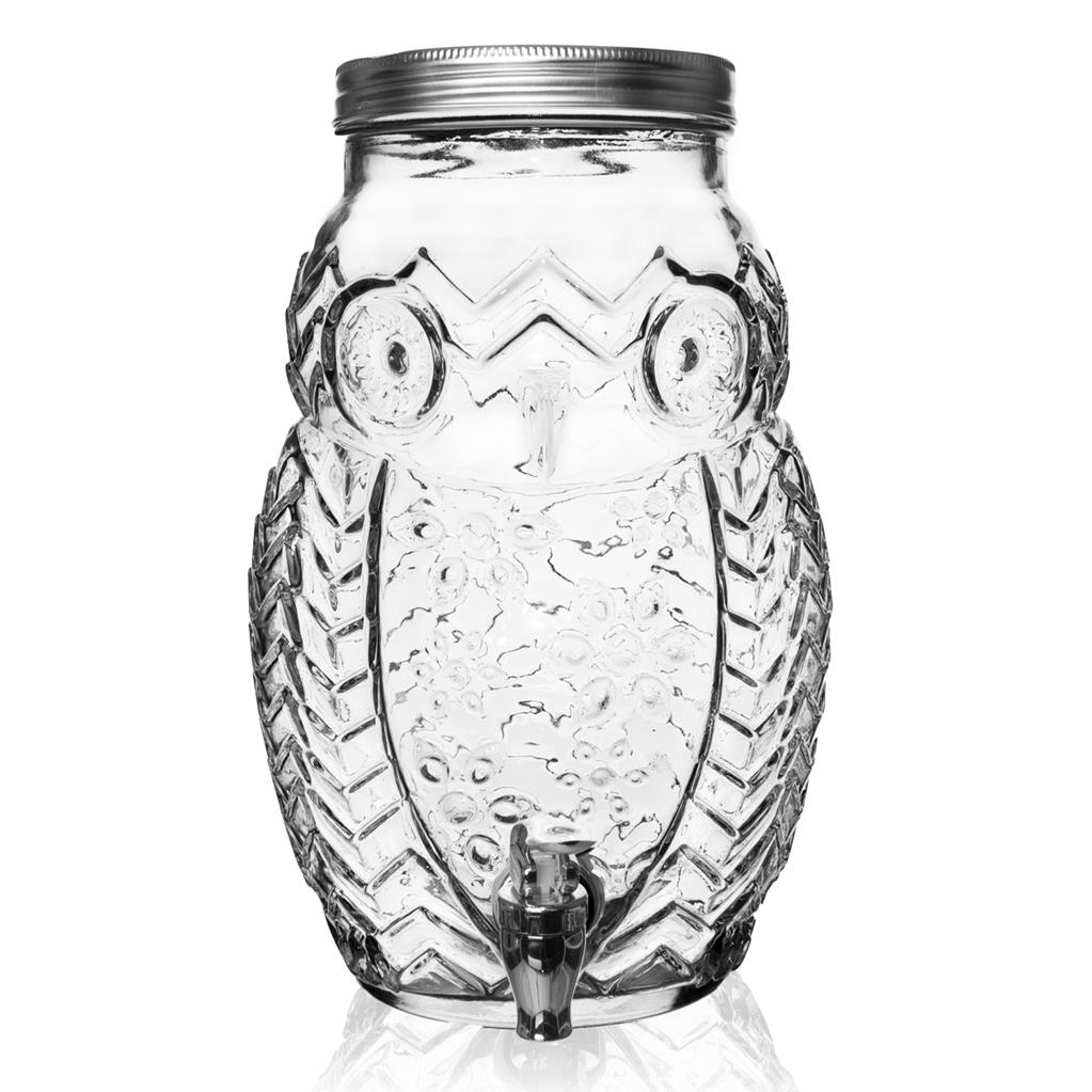 Sklenený nápojový zásobník v tvare sovy predstavuje štýlový spôsob, ako v lete pri záhradných slávnostiach či grilovaní servírovať kokteily, ľadový čaj, domáce limonády a šťavy, ale tiež napríklad aj pivo. Materiál: sklo, kov, plast, silikónové tesnenie. Zásobník nie je vhodný na horúce tekutiny. Rozmery: objem 5,2 l, 19×30 cm.